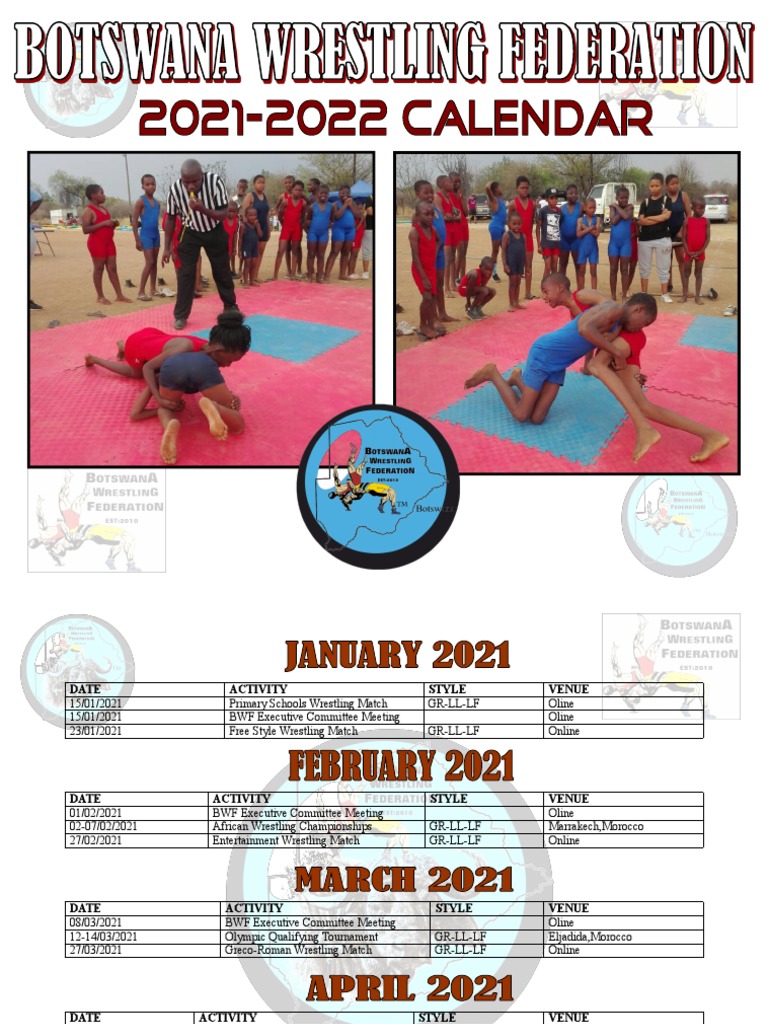 Source: https://www.scribd.com/document/487734579/2021-2022-BOTSWANA-WRESTLING-FEDERATION-CALENDAR-OF-EVENTS